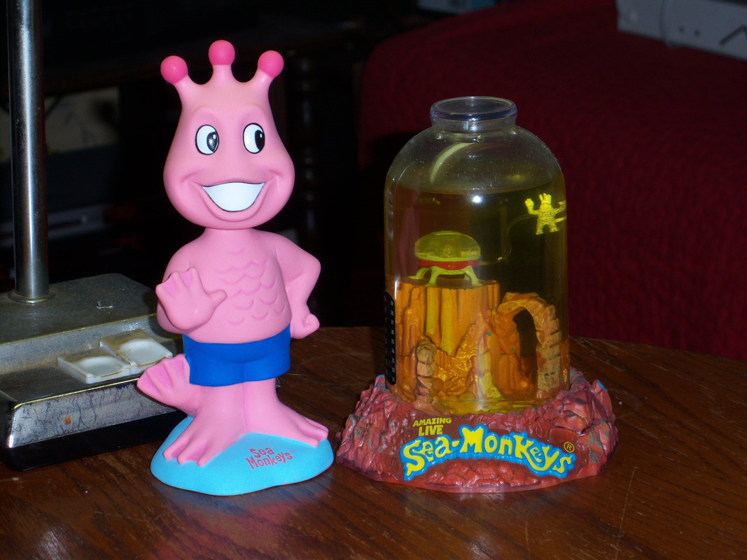 If you watch the video, the largest sea-monkey in the tank is the female, Bertha, from the ocean zoo. She seems to be exploring her new home. The dozens of baby sea-monkeys can be seen swarming about the tank as well.