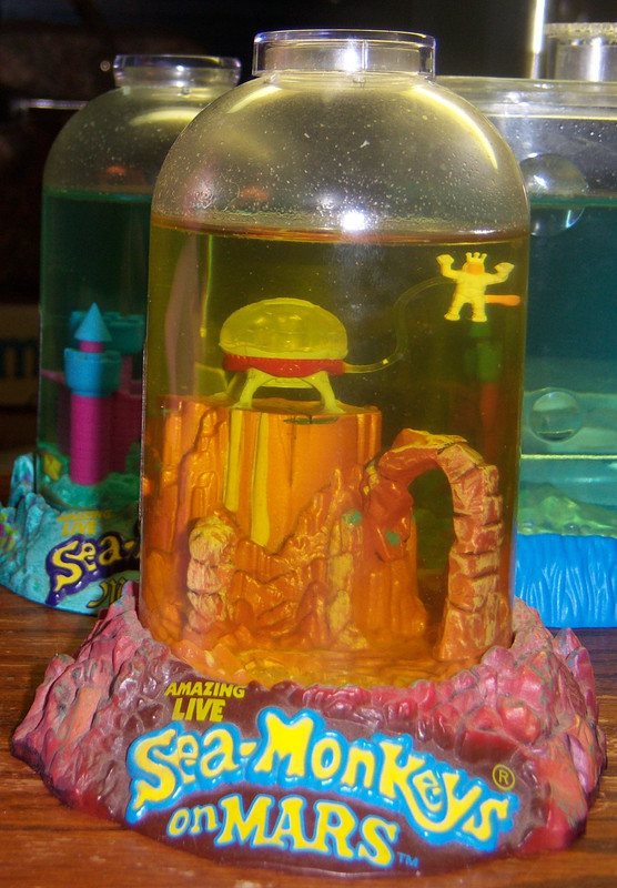 Ocean Zoo - Now sports a binocular cover. Bertha is still going strong. I haven't seen any other Sea-Monkeys in the tank today. Fed a half small scoop of Red Magic for feeding. Also here is a sweet close-up of Bertha. Shakey stands to the side and observes.