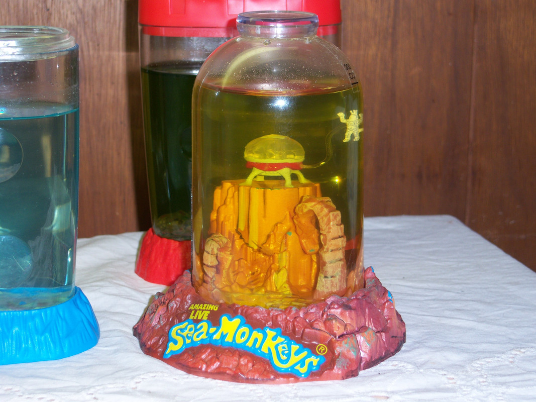 Still monitoring the other two zoos. The ones in the red zoo are getting some size to them. I can only see one tiny Sea-Monkey in the green zoo.