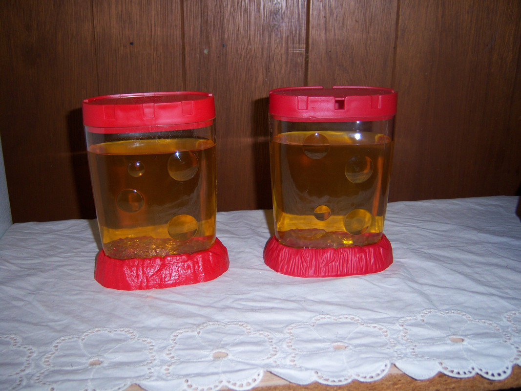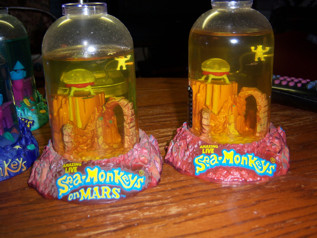 I decided that the old style Mars tank needed a bit of maintenance. First of all the water was too orange and it was hard to see the Sea-Monkeys in the tank, especially any tiny babies that were in there. First I prepared a quart of water. Jumbo Plasma makes a quart of water, too bad they don't sell it any more... I am down to my last pouch! Then I used the aqua-leash to get the two males out of the tank and transferred them to a waiting Ocean Zoo. After this I poured off about 2/3 of the tank into another Ocean Zoo, then I topped off the Mars tank with clear plasma water and transferred the males back into the tank.